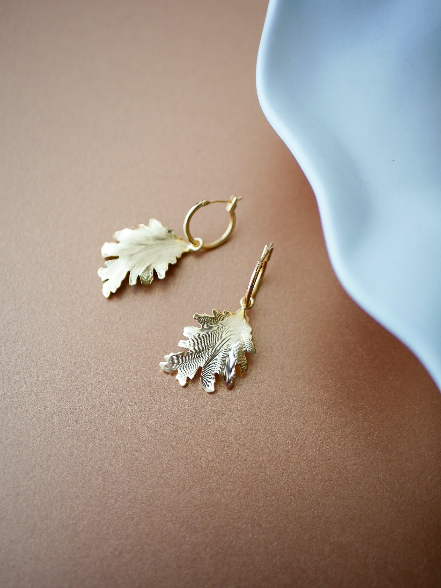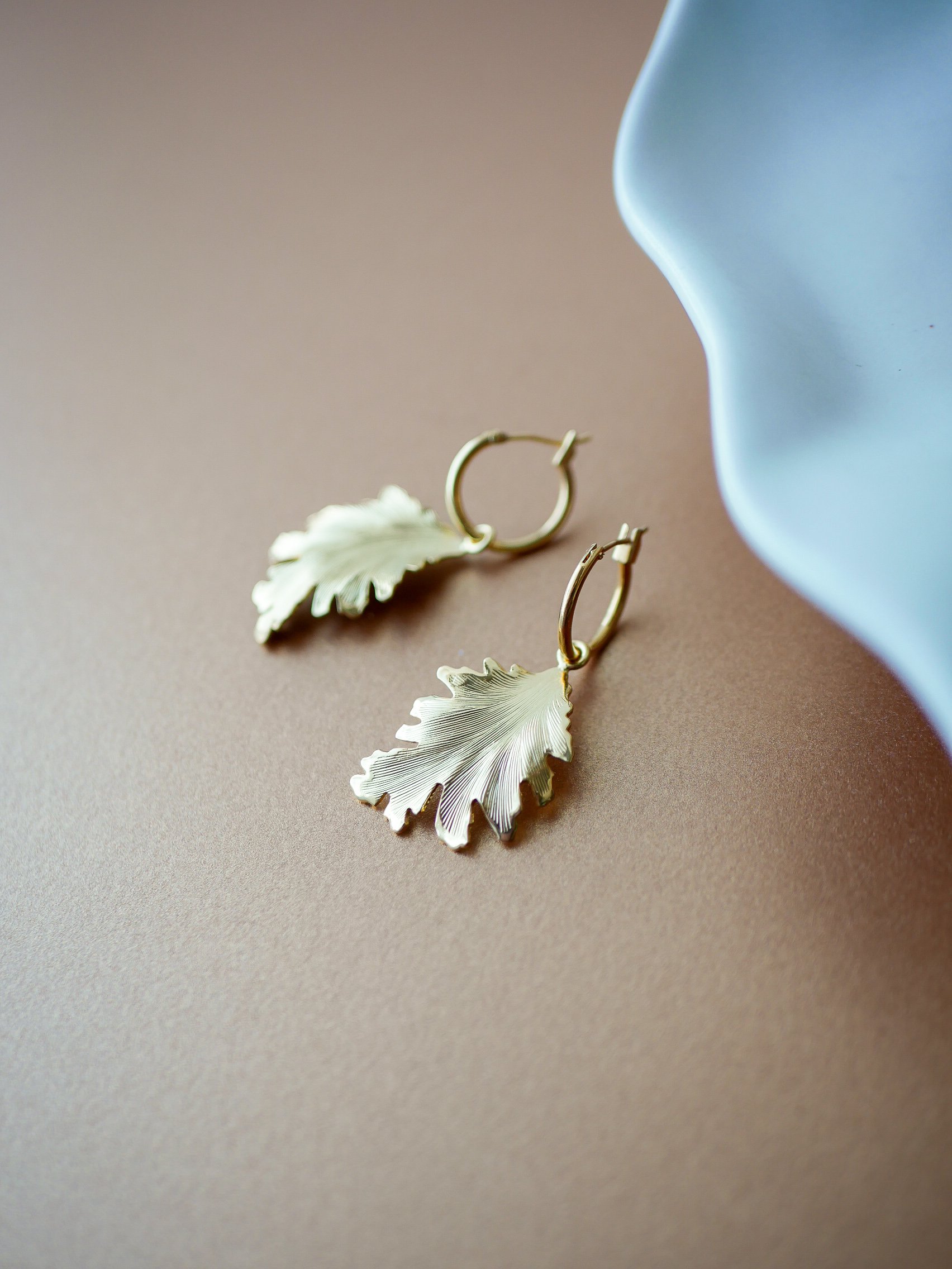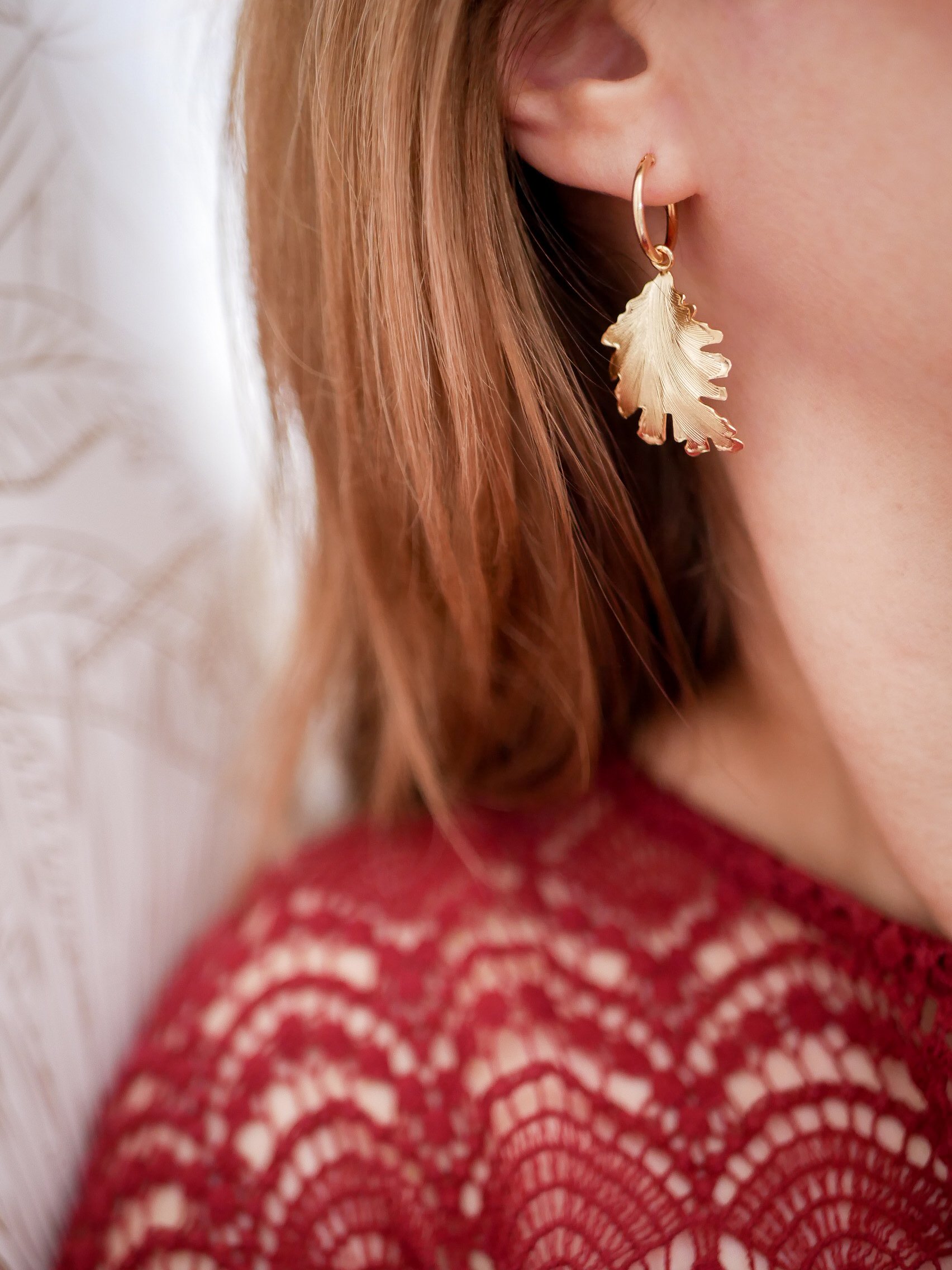 Créoles avec feuilles de taille moyenne de la gamme ALBANE dorées à l'or fin 24 carats ou plaquées argent 925.
